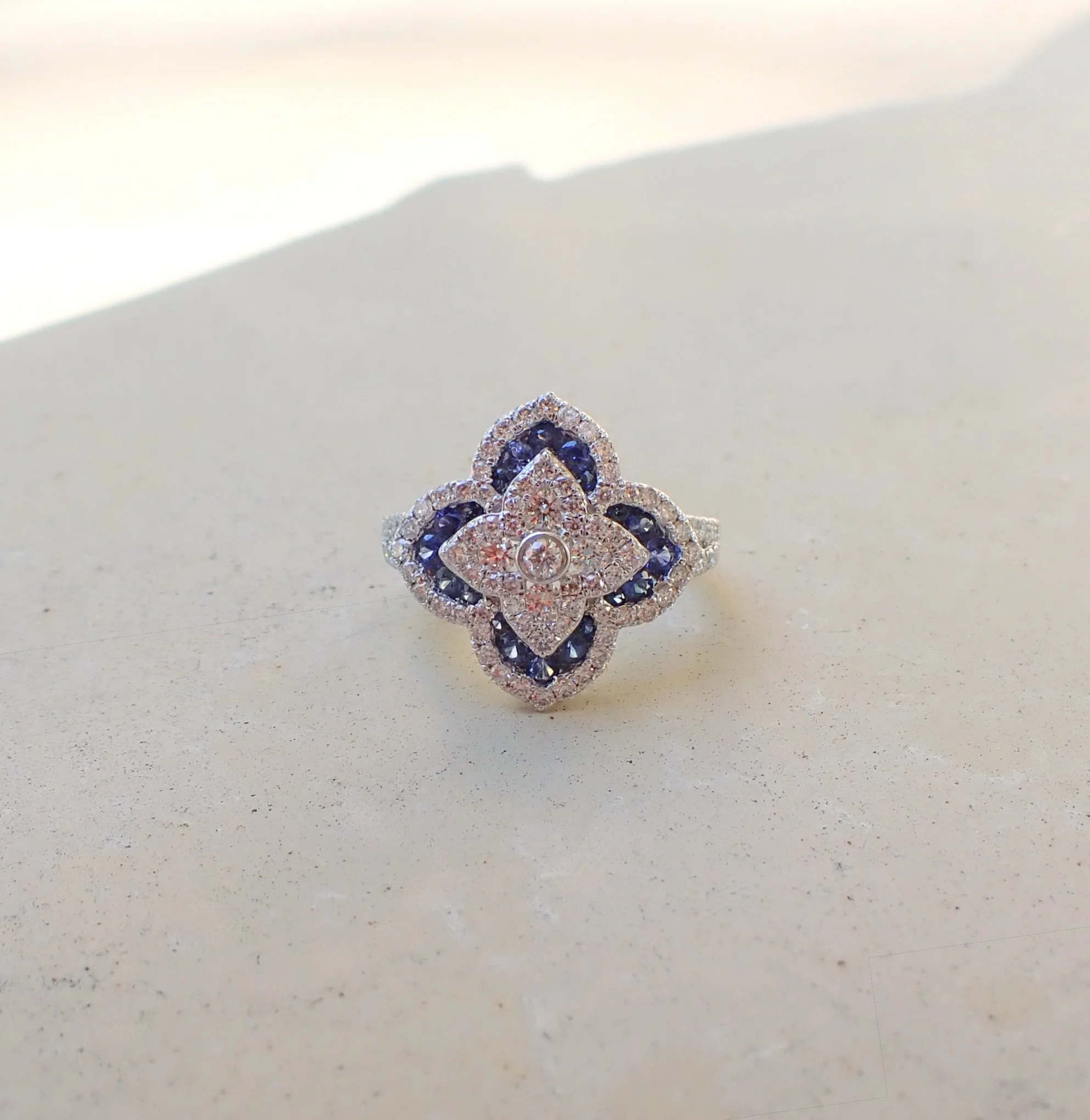 14k White Gold Flower Ring with 1.05 carats of Natural Diamond and 0.06 carats of Natural Sapphire - Price Upon Request