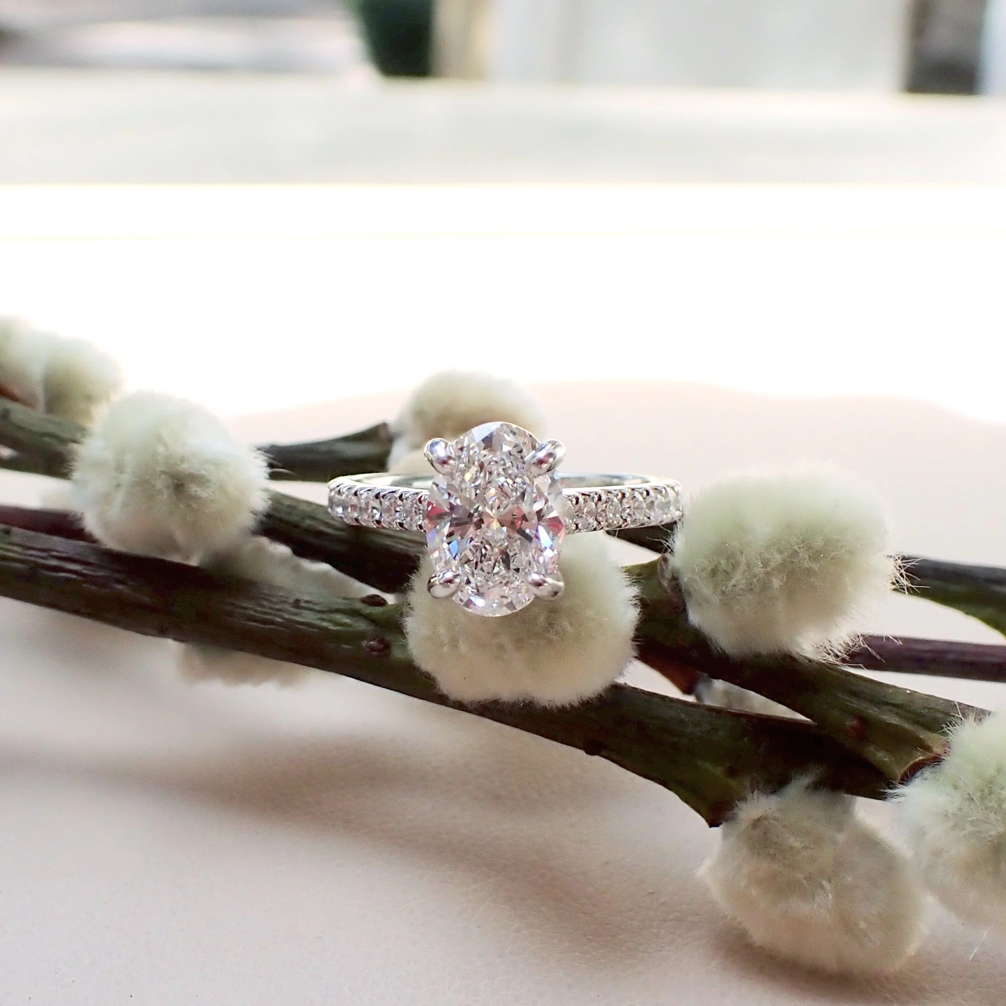 18k White Gold Engagement Ring with a 1.55 carat Oval Brilliant Cut Lab Grown Diamond and 0.42 carats of Natural Diamond - $4255