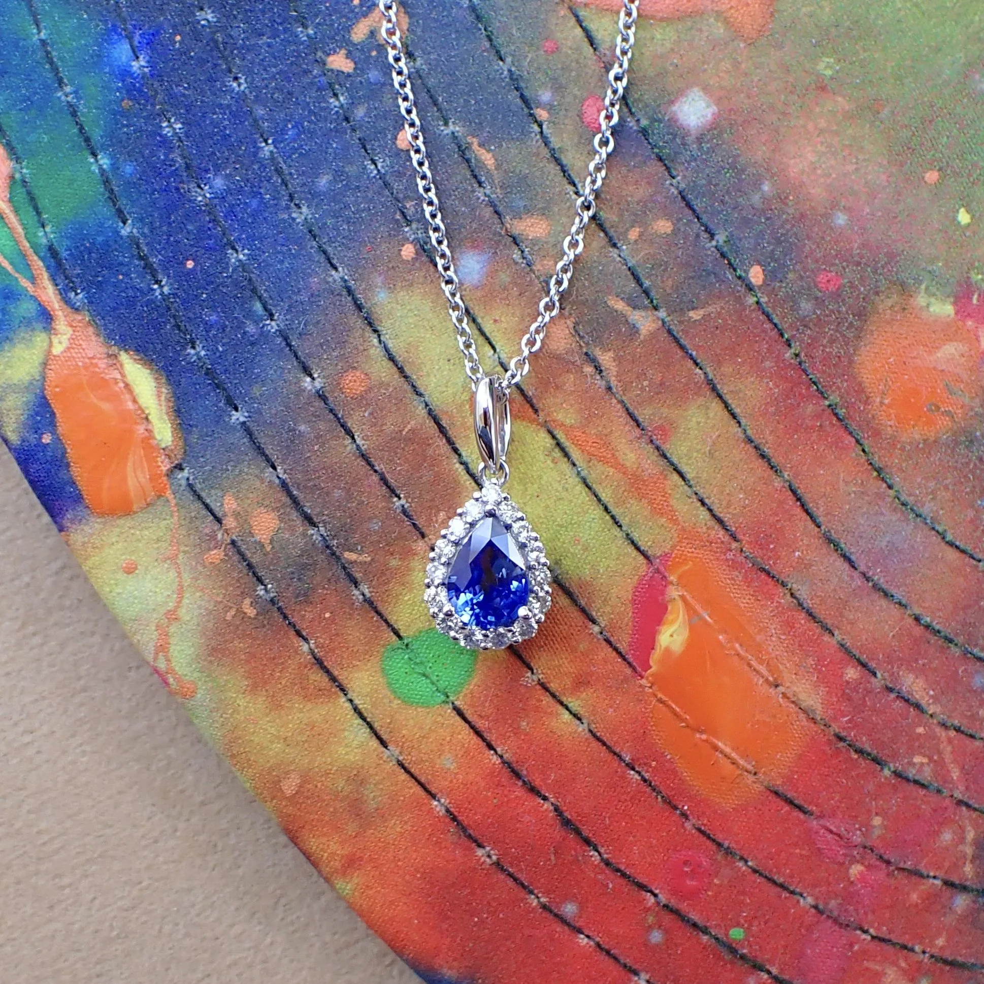 18k White Gold Pear Shape Pendant with 0.73 carats of Blue Sapphire and 0.20 carats of Natural Diamond Hangs from a 16” 1.3mm Cable Chain - $1765