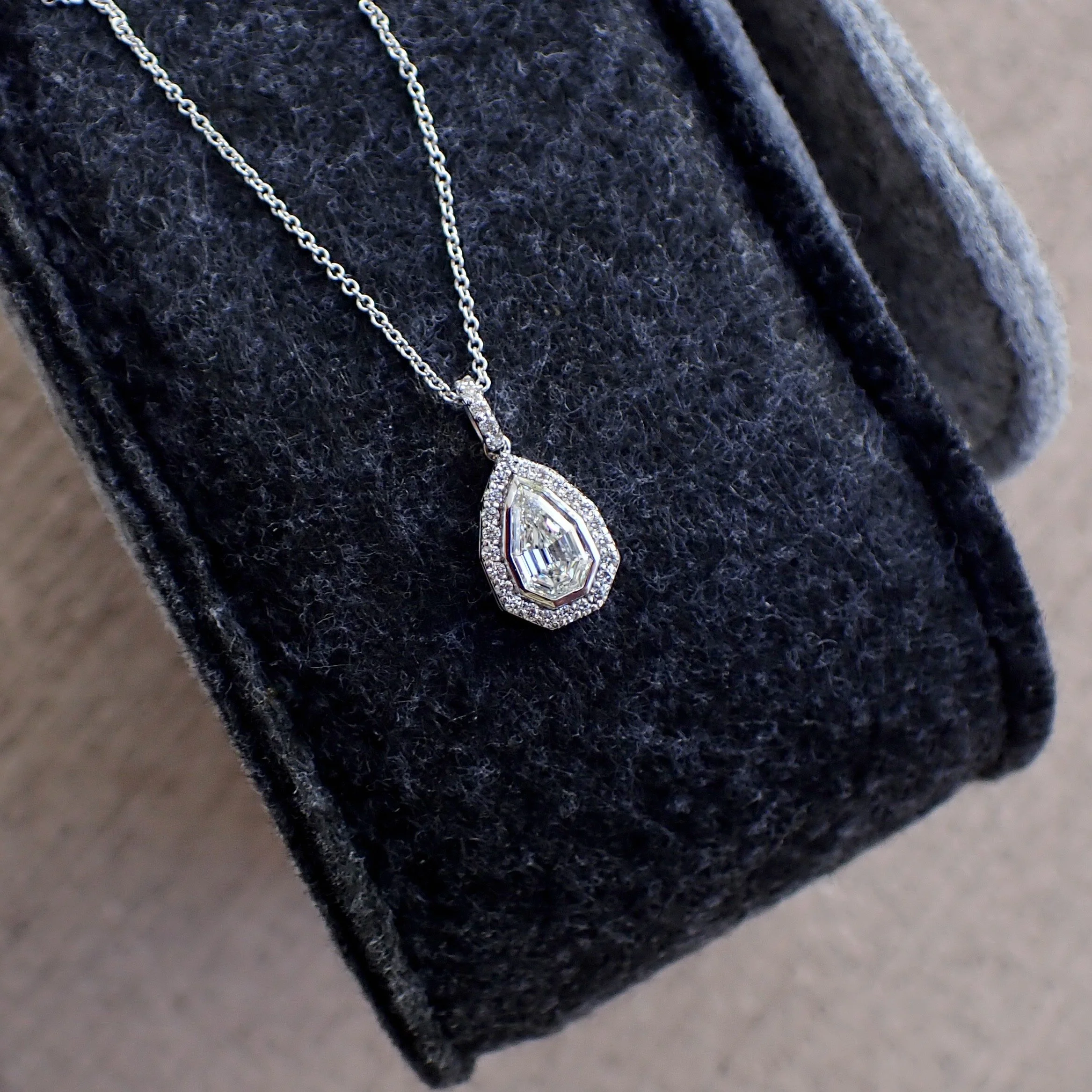 18k White Gold Pendant with a 1.05 carat Nonagon Step Cut Lab Grown Diamond and 0.28 carats of Lab Grown Diamond hangs from an 18” 1.3mm Cable Chain - $4090